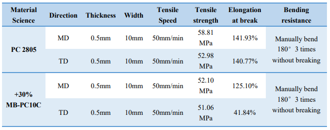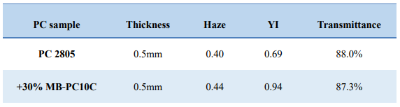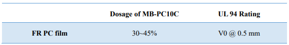 MB-PC10C is a master-batch of Inovia DR-S15 with a 10% active component. It can achieve UL94 V0 flame retardant level for PC plastics in the thickness range of 0.05-1.6mm and fully maintain the transparency of PC plastics. The transparency of the obtained flame-retardant PC film is kept intact. It can be used in terminal markets such as battery packaging/packaging, electronic device displays, etc.